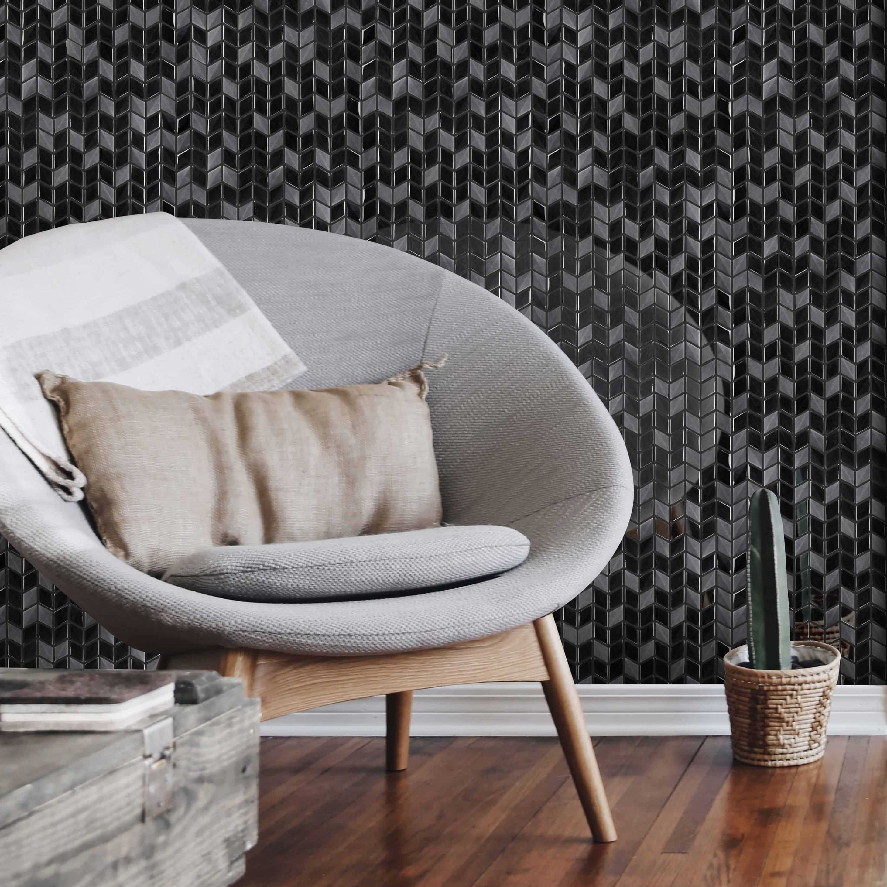 The unique shape and texture of Tulip tiles are ideal for herringbone patterns, and mimic the look of stitched wool. The classic colours of these recycled glass tiles will turn any space into a chic and comfortable place to unwind.