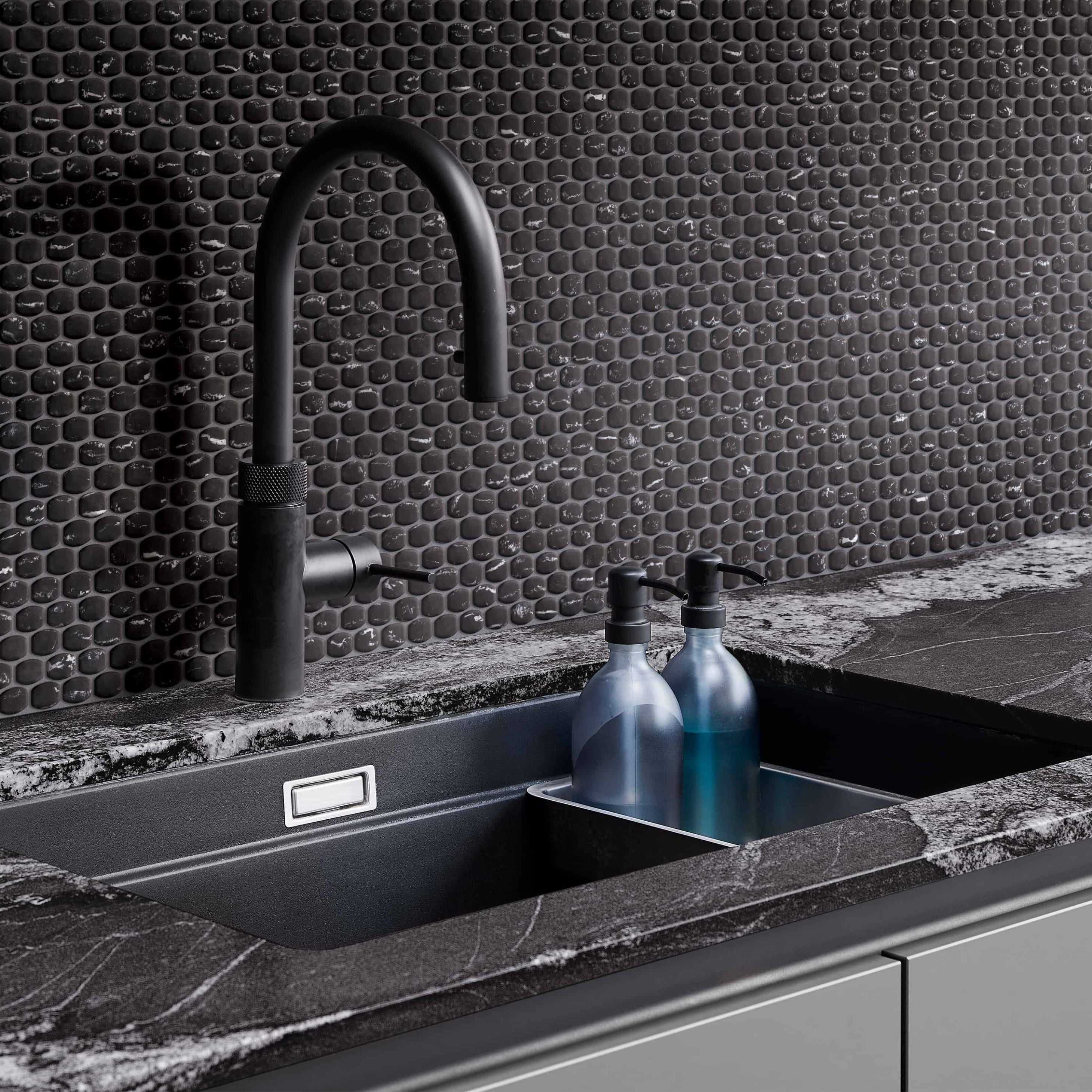 Similar to the veining of marble, Tobico's contrasting linear variations bring out the charm of this matte mosaic. From these discret recycled glass tiles emanates a quiet presence, highlighted or not by the choice of a contrasting or matching grout.